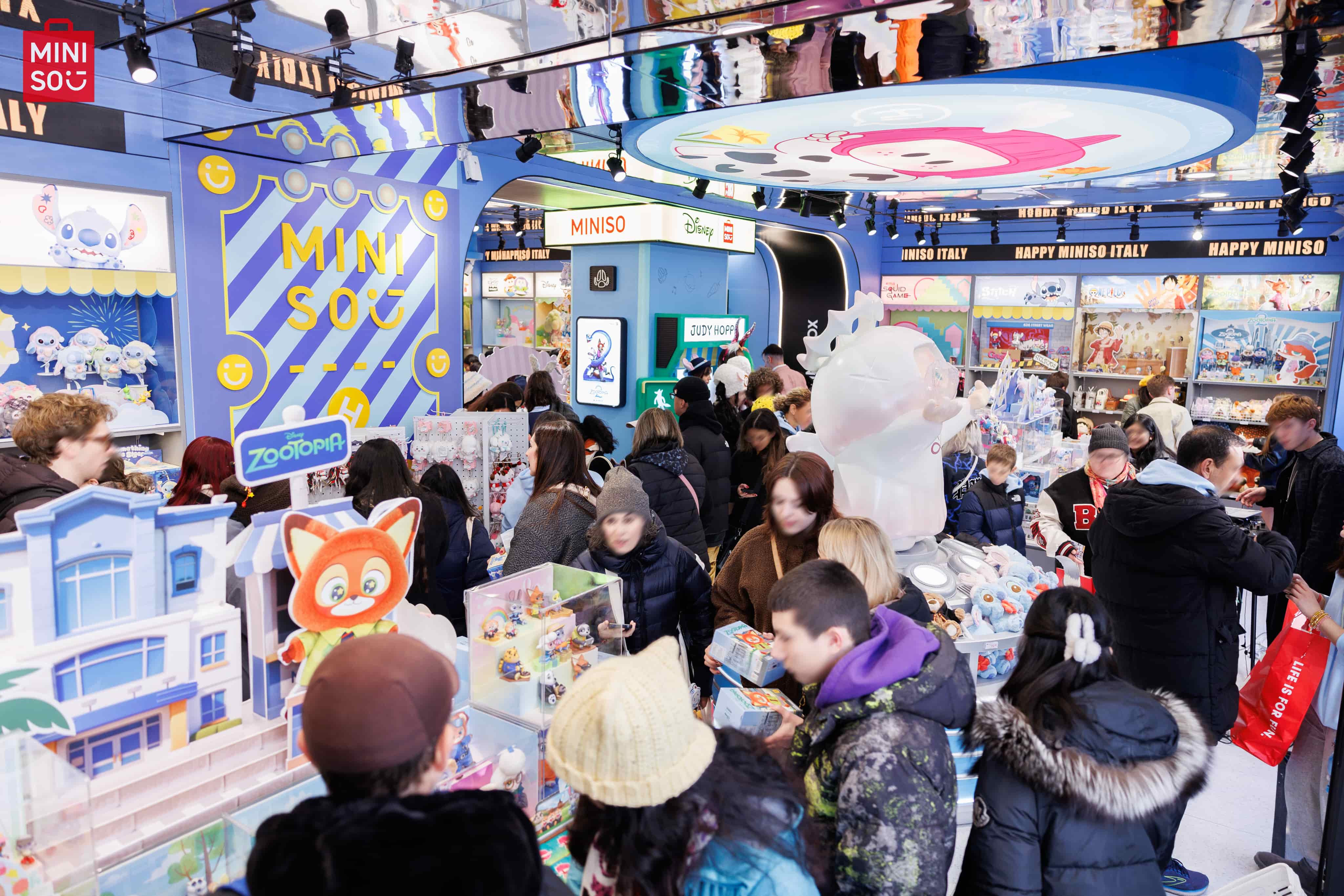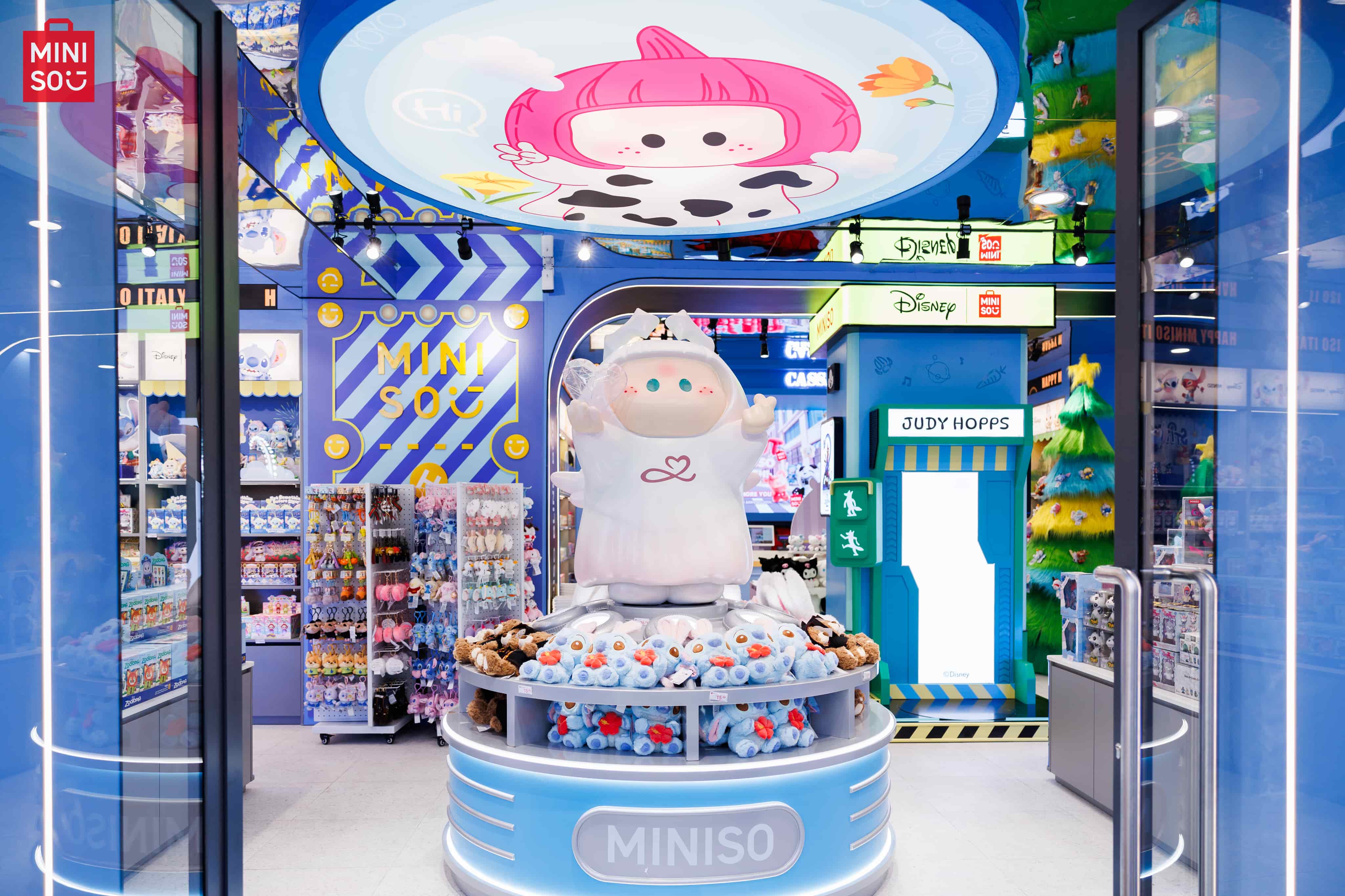 The store’s design further elevates the experience, featuring a striking blue-and-yellow color palette that creates a bright, modern, and energetic atmosphere. A giant Stitch figure transforms the storefront into a distinctive visual landmark. Inside, a large installation of MINISO’s signature IP, YOYO, anchors the interior, alongside themed zones dedicated to trending characters. The Zootopia-themed section, designed with playful details and photo-friendly backdrops, quickly became a top draw and sparked active social sharing.