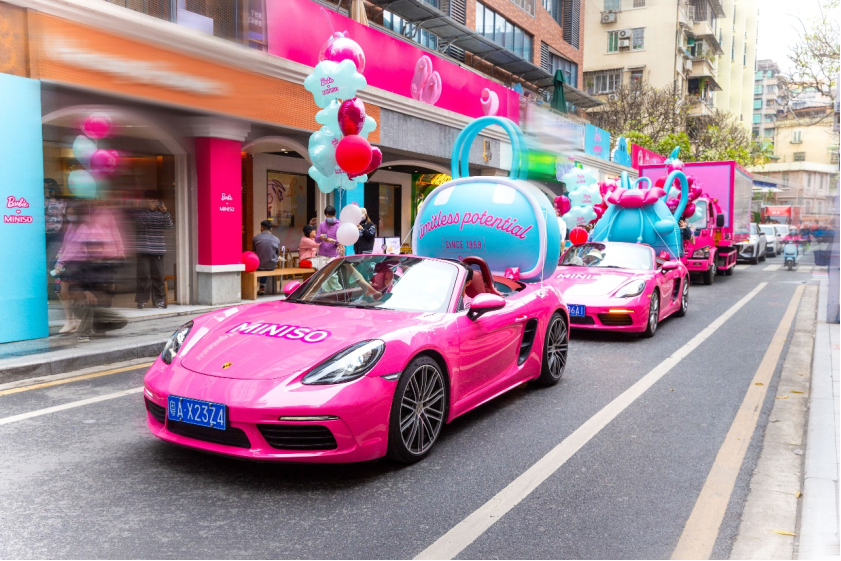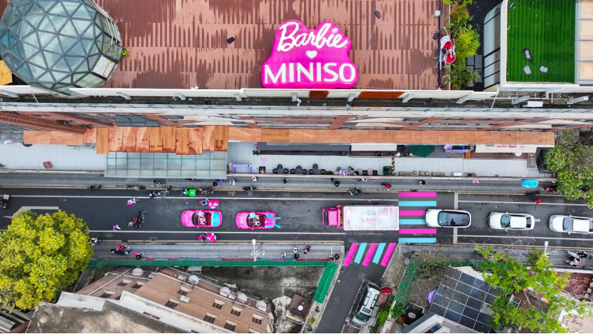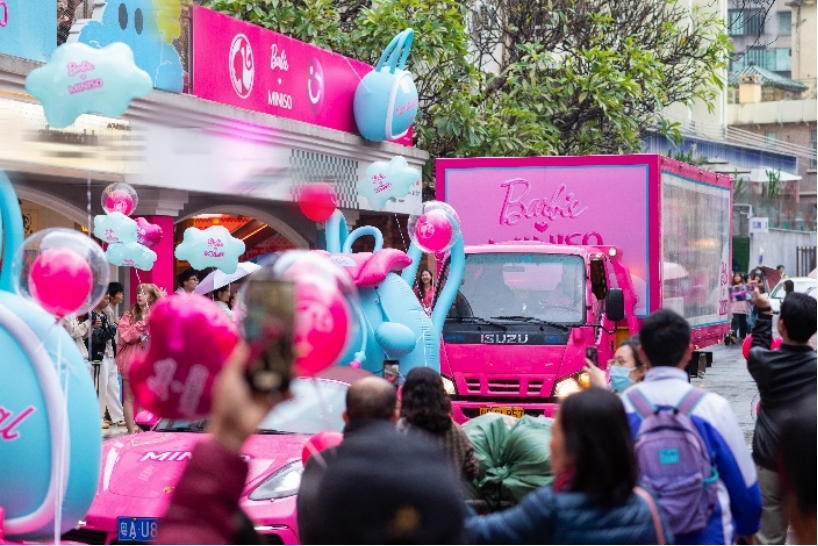适逢芭比 65 周年纪念日,名创优品以“姐姐妹妹粉上天”为主题,打造花车巡游的创意场景,将芭比粉的优雅与名创优品的时尚元素结合,借此鼓励当代女性“You Can Be Anything“,鼓励年轻一代自由追逐不同的事业与兴趣,玩出无限可能。