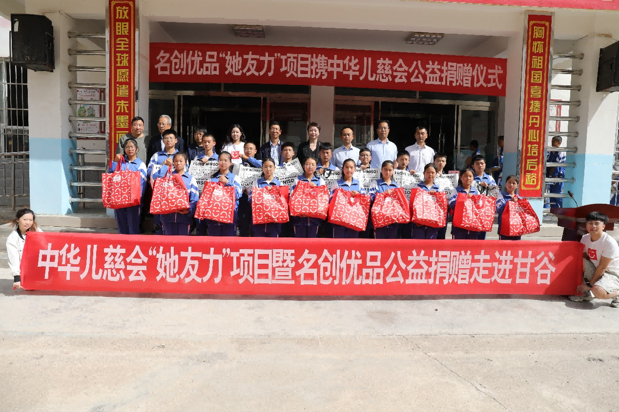 名创优品自2021年携手中华少年儿童慈善救助基金会推出“她友力”公益项目,此次为甘肃省天水市甘谷县四所学校超过1000名学生捐赠了卫生巾、书包、笔记本、笔、雨伞、便当盒、餐具、保温杯等总价值超过20万的生活教育物资,同时携手TOP TOY、摘星阁、谷雨等品牌一齐助力,共同为发展中地区的留守女童带去帮助,希望达到一加一大于二的公益影响力。